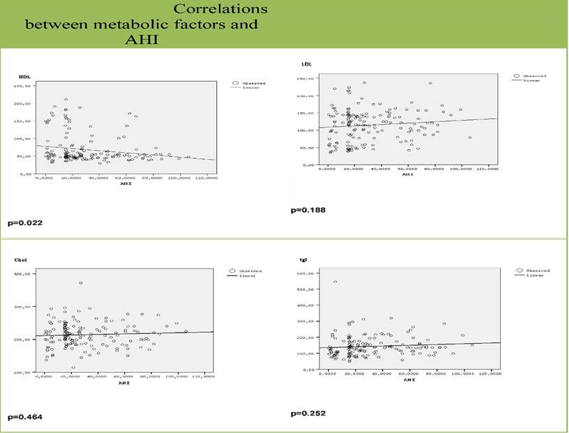 Finally, HDL was inversely correlated with AHI (p=0.022). This correlation also remained significant even after adjustment for age and BMI (p=0.014). There was no correlation with any other metabolic factors (figure 3).