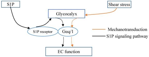 Glycocalyx integrated the shear stress and S1P signals. Gαq/11 activation independent of S1P1 activation in endothelial cells (ECs). Glycocalyx might play important role in mechanotrasduction and interaction between Gαq/11 and PECAM-1. S1P protects the integrity of glycocalyx via S1P1 in ECs. Thus, the glycocalyx could potentially be a signaling platform that integrated the S1P and shear stress signals for maintaining vascular homeostasis.