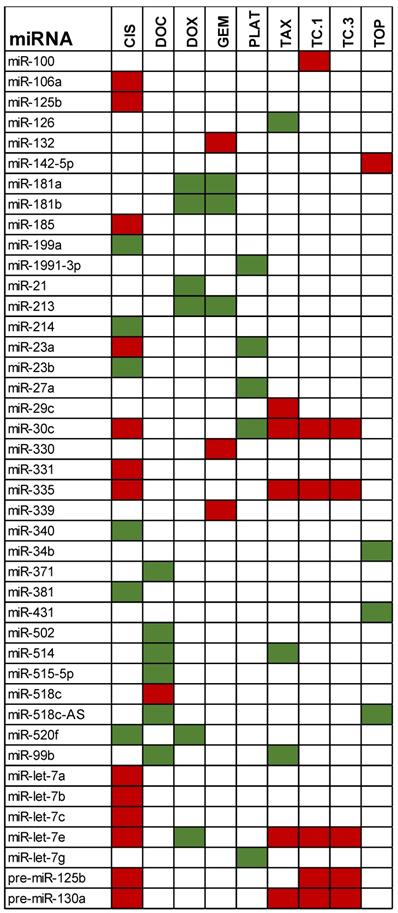 Highly expressed miRNAs showing a resistance towards chemotherapeutic drugs. Green represents increased expression while red represents the miRNAs that were deregulated.